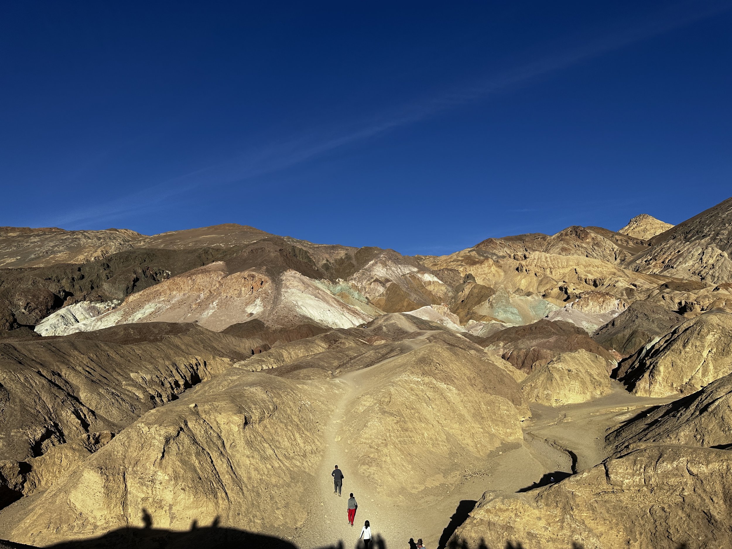 On Christmas Day, we took a small group tour to Death Valley. We hit all the major spots - Zabriskie Point with panoramic badlands views, Badwater Basin, where we walked on salt flats 282 feet below sea level, and my favorite, Artist's Palette. The vibrant colored rocks - pinks, purples, greens, and yellows all swirled together from mineral deposits - were unlike anything we'd seen. The one-way loop road winds through these colorful hills, and the colors are just stunning. At night, we stargazed - the Milky Way stretched across the sky with zero light pollution.